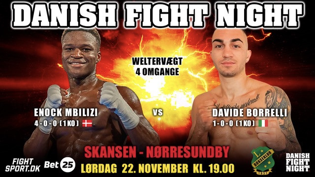 Danish Boxing Promotion bokseren Enock Mbilizi (4-0) er på programmet, når Danish Fight Night og Lindholm Bokseklub holder pro-am stævne i Skansen i Nørresundby den 22. november. Her møder han italieneren Davide Borelli (1-0).