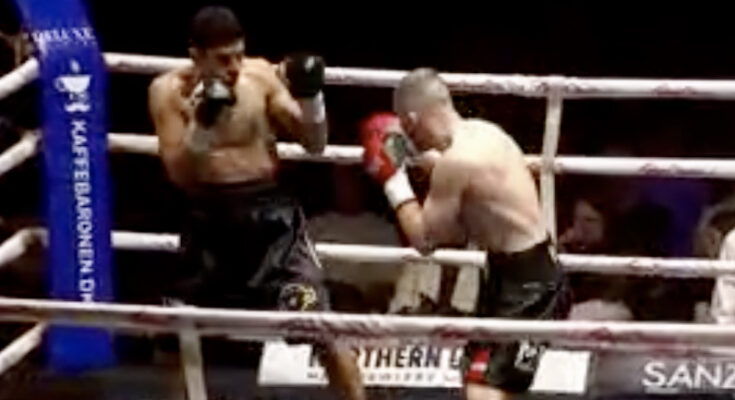 Mohammed Al Maliki (nu 3-2) fra Sverige har i starten svært ved at fange den bevægelige og teknisk dygtige højrefodsbokser Denys Pesotskyy (nu 3-0) fra Ukraine.